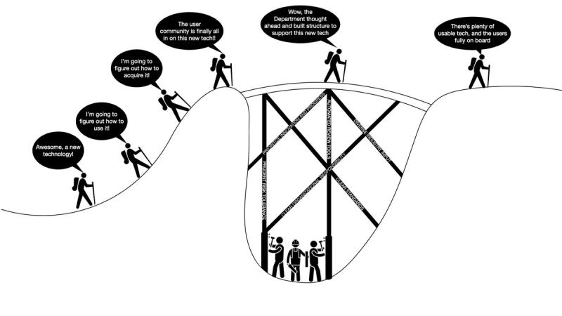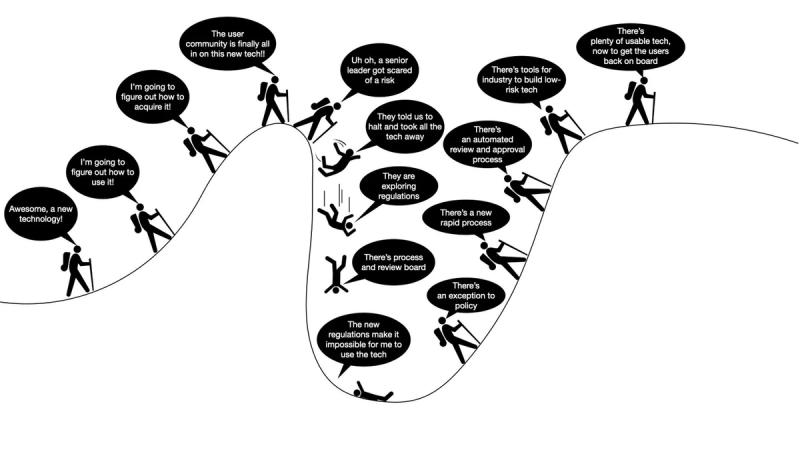 In the context of the Federal government (which is our main focus here), when a new technology is introduced, it usually follows a predictable pattern: Discovery, Adoption, Regulation, Regulatory Winter (a period where the the tech is frozen while the policy wonks figure out the regulations), Adaptation around Regulation, and finally, Re-adoption. How do we know? Let's look at how the Department of Defense went about adopting off-the-shelf drones. In the early days, right after DJI and others of their ilk showed the consumer market that cheap, fun, useful drones were within their reach it shot to the top of everyone's Christmas list and every operator's IPL, STIPL, and UFR list. Shortly thereafter all the cool kids (Special Operations in particular) had pocket-sized quad copters buzzing low and fast from back yards to Bagram.