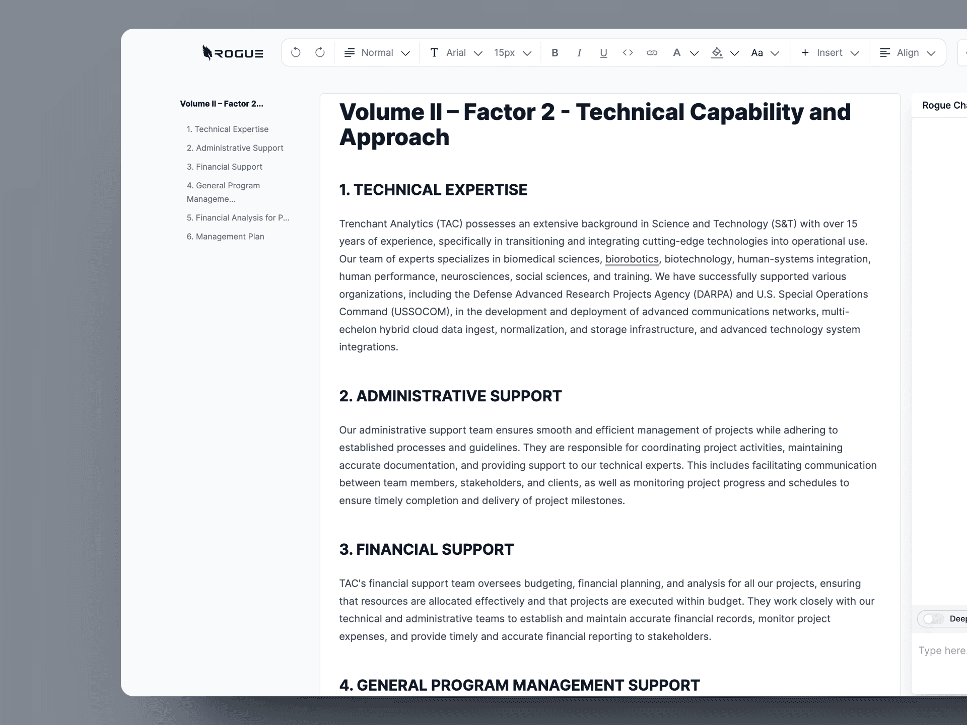 Rogue AI RFP Writer helps you get up and running with your RFPs in no time. Simply Enter your document title, description and template and Rogue will automatically generate a RFP Proposal Document for you to use.