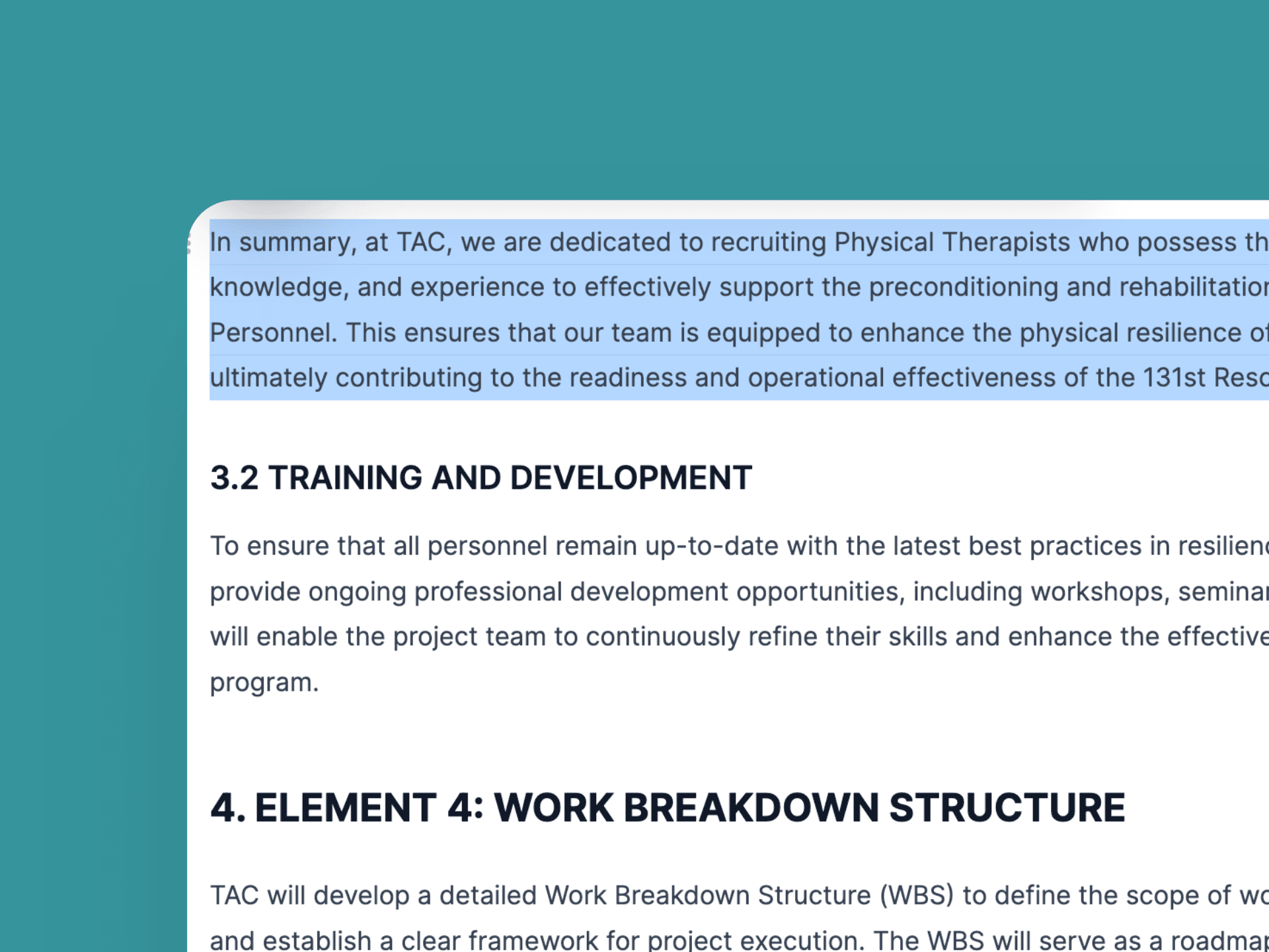 No more document check-in's with multi-user editing Have your entire team power write at the same time, each use has full access to all AI tools and everyone can see everyone's edits so you can go from a draft to a Red Team Draft in an hour, not a week.