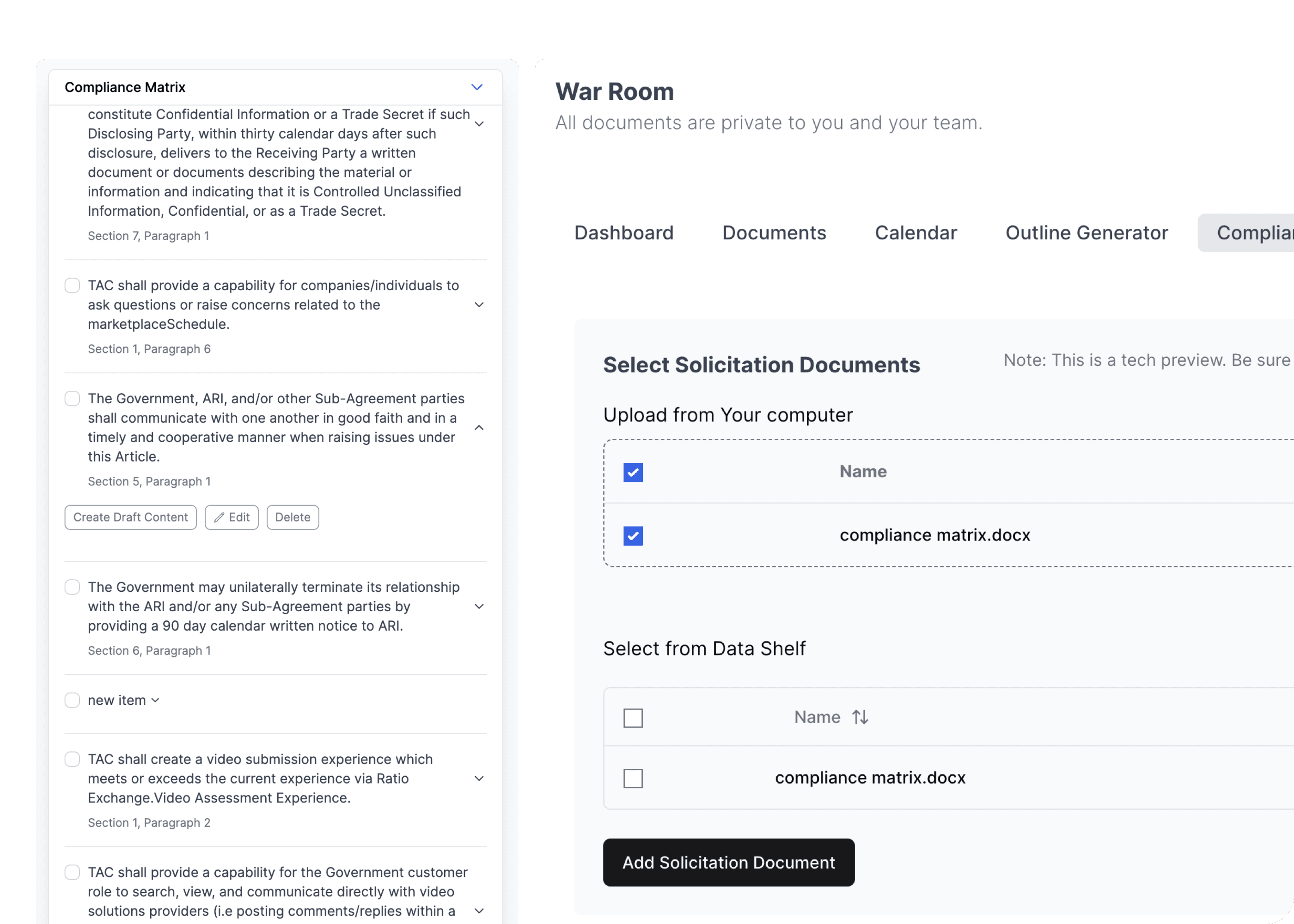 - With strategic precision. Our AI intelligently analyzes Sections L&M to generate a comprehensive outline, then seamlessly integrates relevant portions from Section C directly into your volume template. This intelligent mapping ensures perfect alignment between requirements and responses, eliminating critical gaps in your proposal.