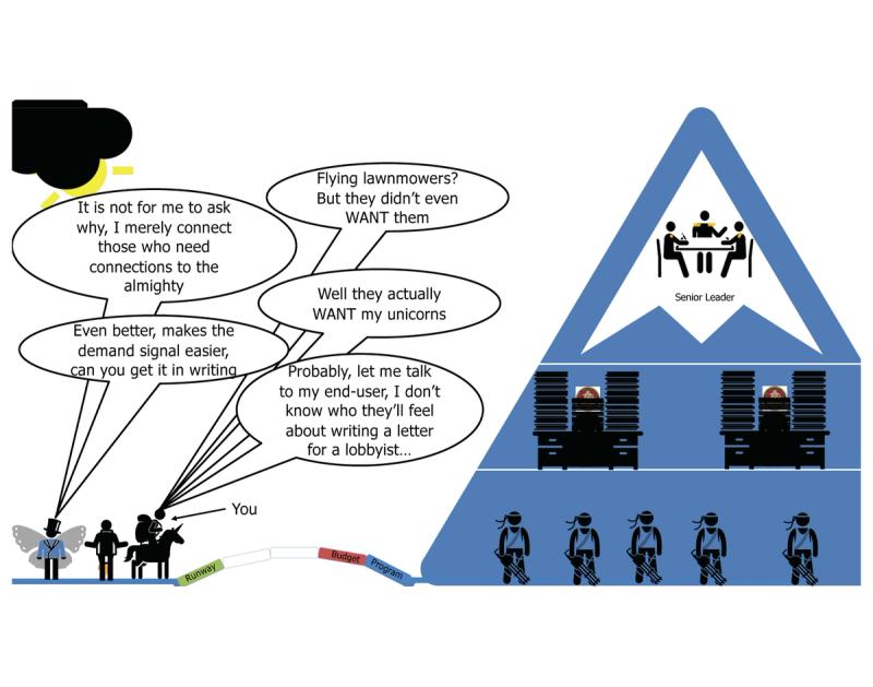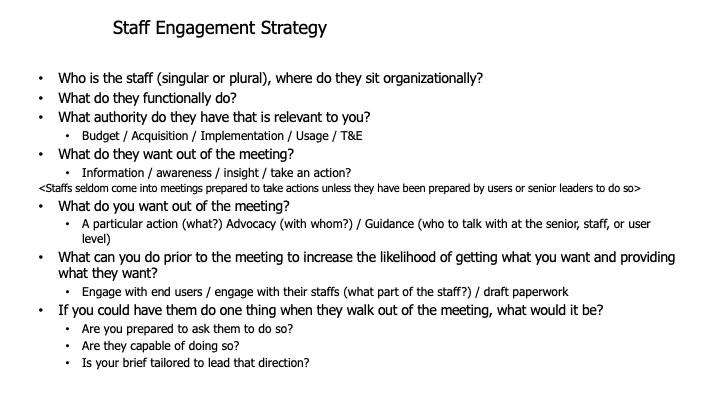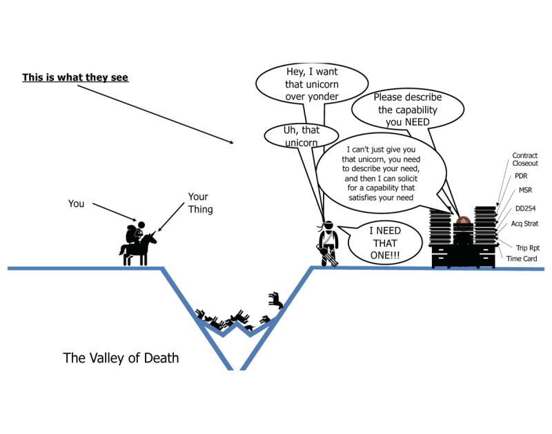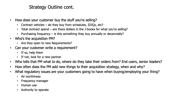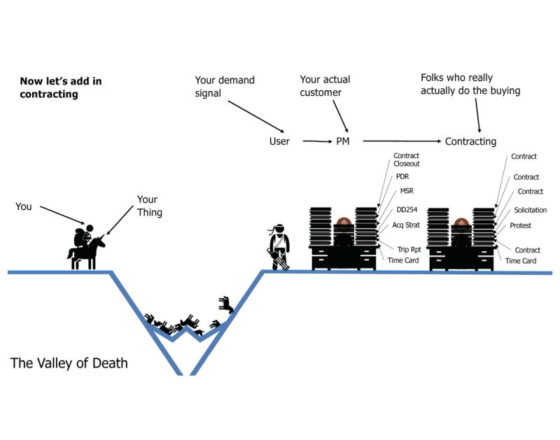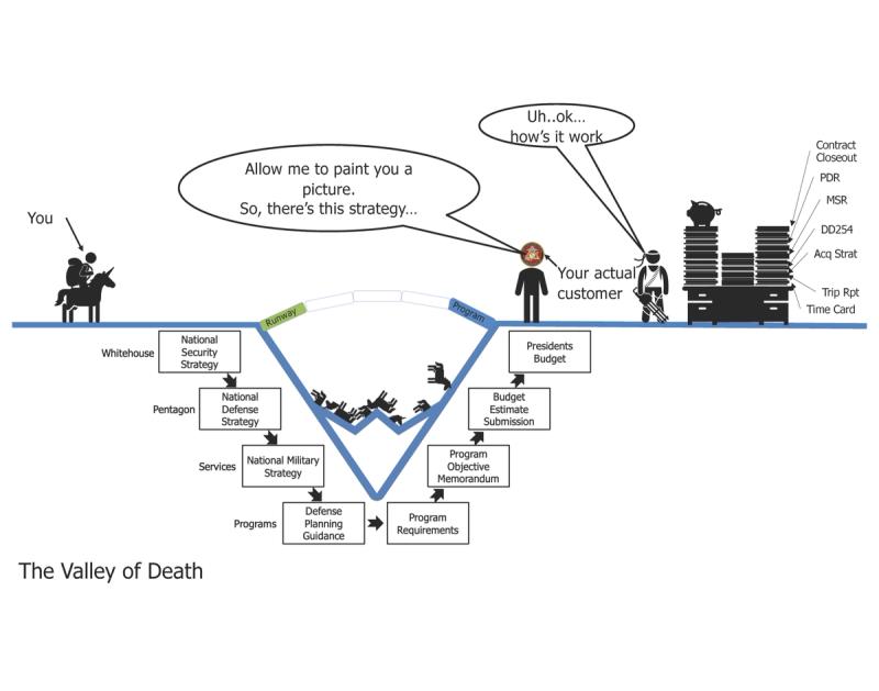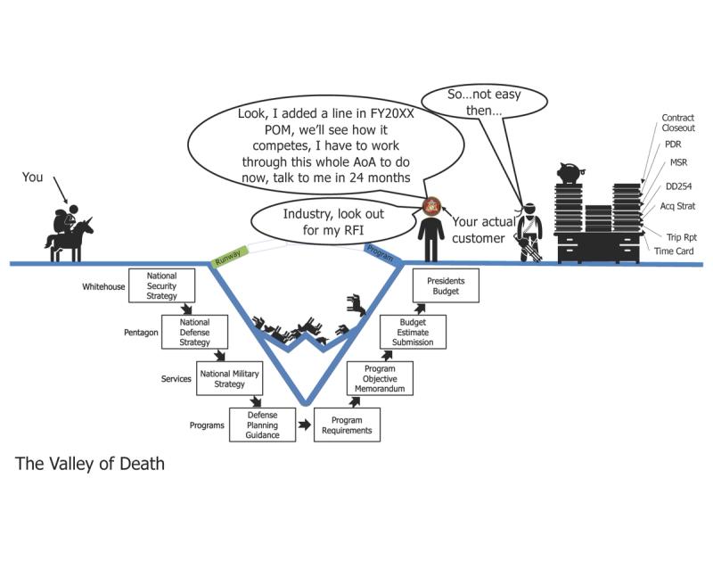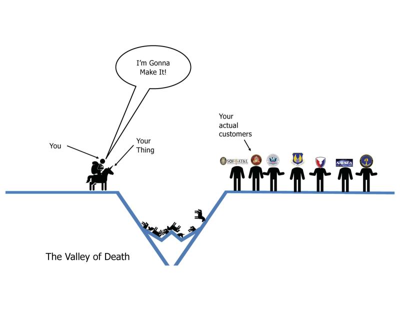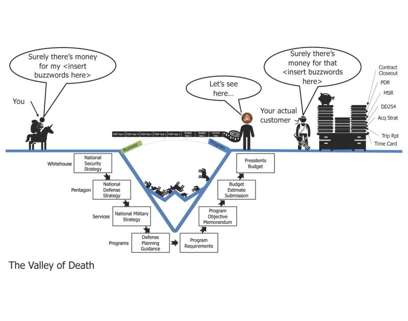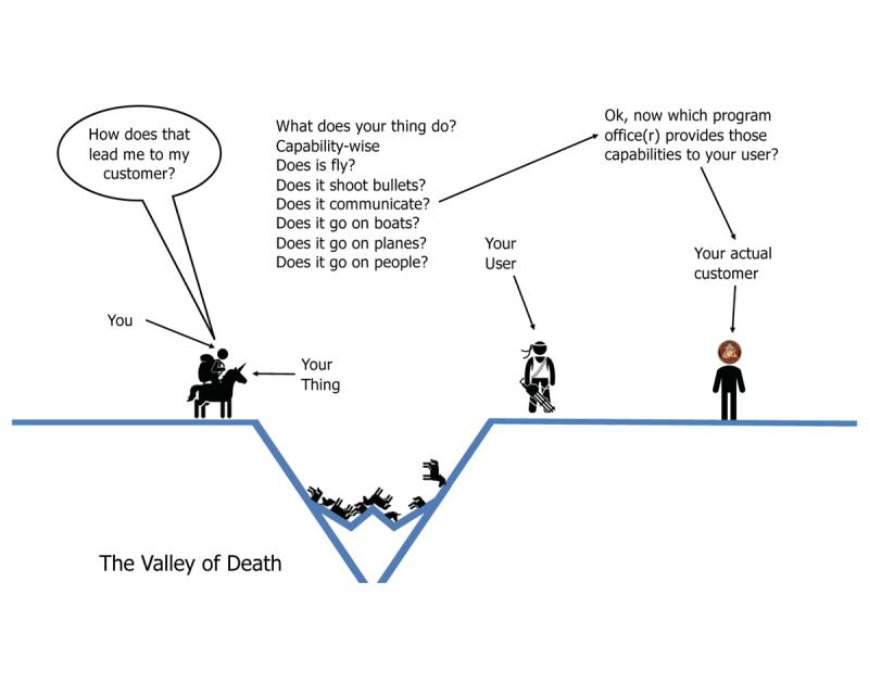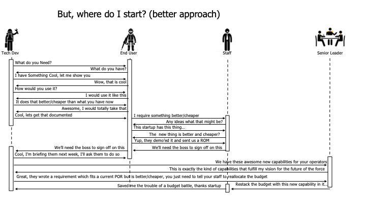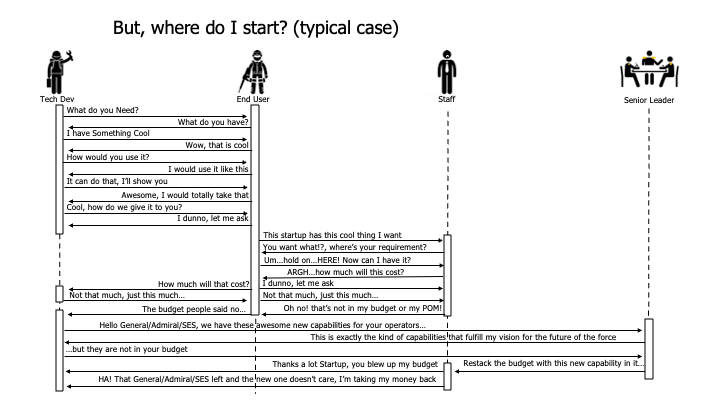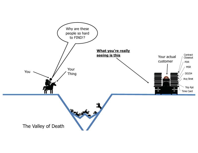 The way MOST developer folks do this (poorly) is they start with the end user, and they think that will work. There's good reason for this; developers are told by the DoD to "engage with us" and "talk to our end-users, they drive out requirements", which is true. So developers dutifully go to demo events, and expos, etc. End-users likewise reciprocate, they like new things, particularly those which promise to make their lives better. But there's a hitch: end-users don't BUY ANYTHING, the bureaucracy does.
