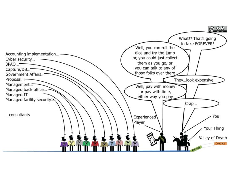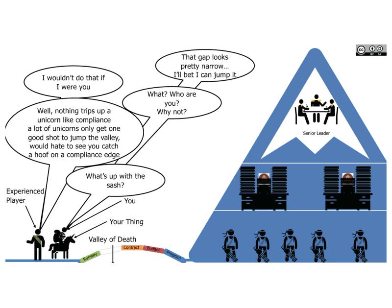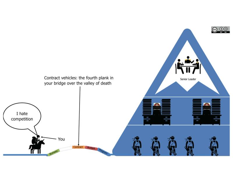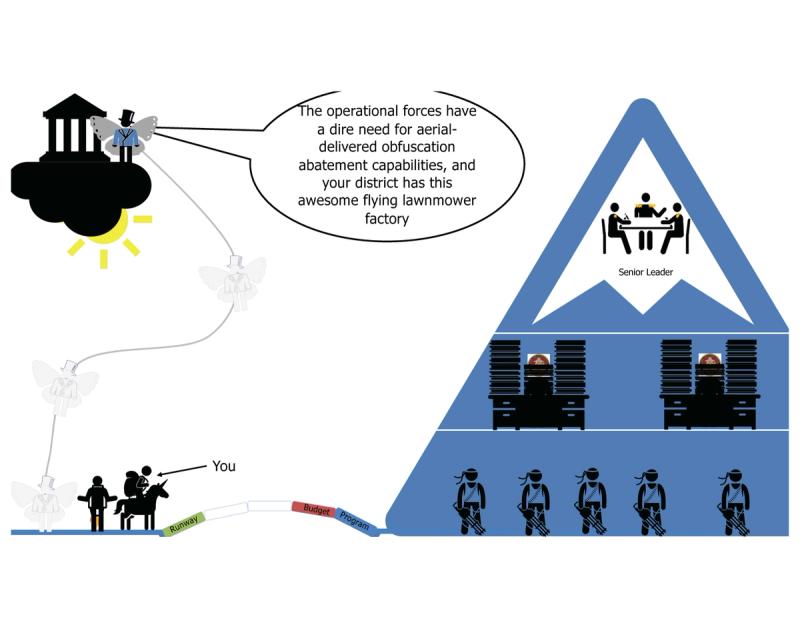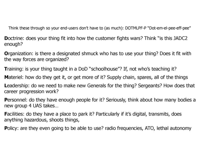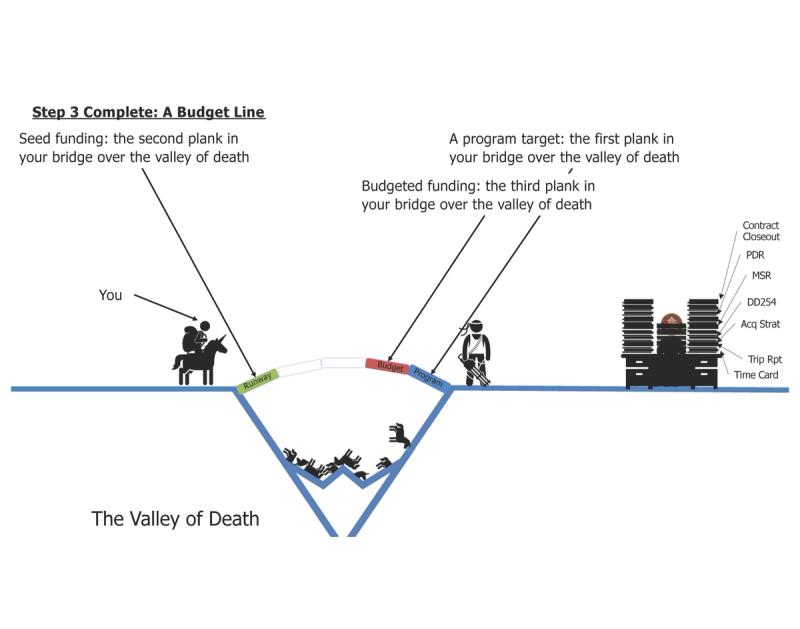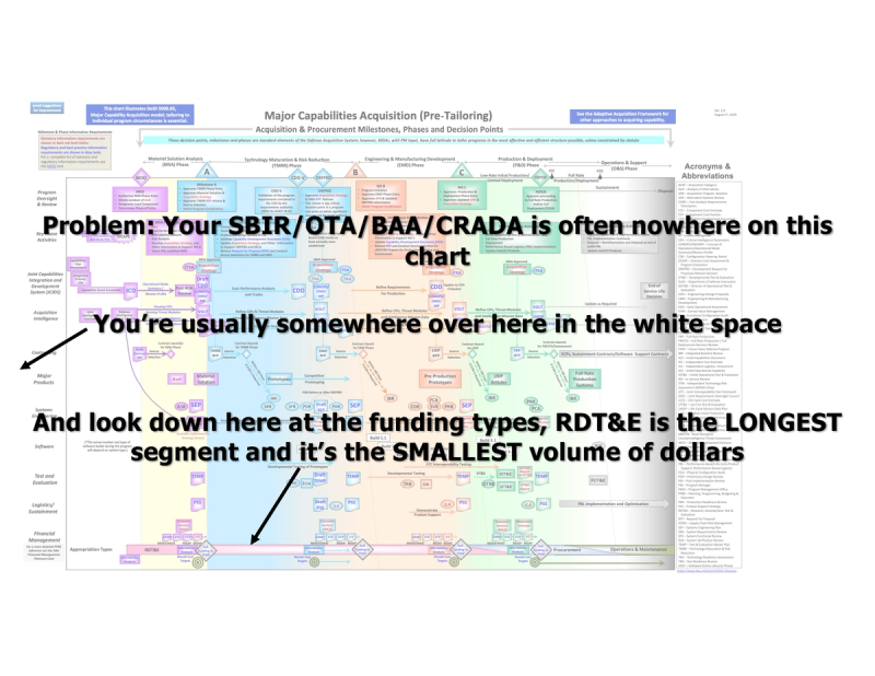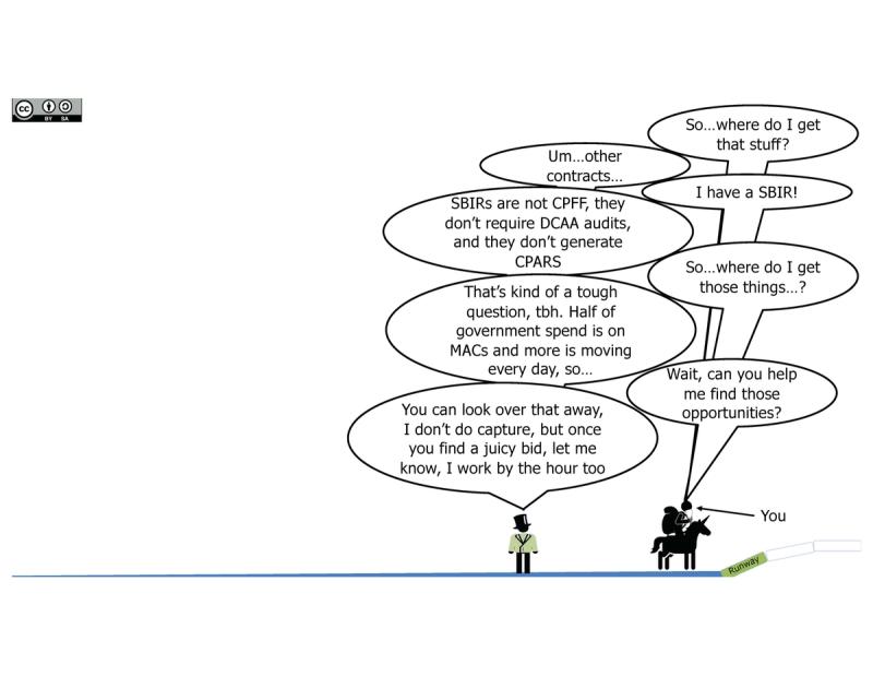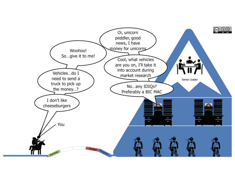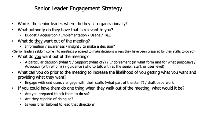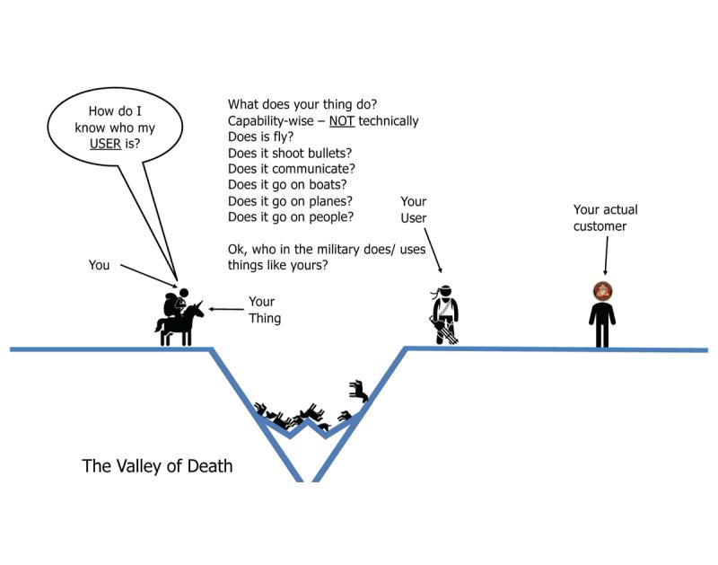 The way MOST developer folks do this (poorly) is they start with the end user, and they think that will work. There's good reason for this; developers are told by the DoD to "engage with us" and "talk to our end-users, they drive out requirements", which is true. So developers dutifully go to demo events, and expos, etc. End-users likewise reciprocate, they like new things, particularly those which promise to make their lives better. But there's a hitch: end-users don't BUY ANYTHING, the bureaucracy does.