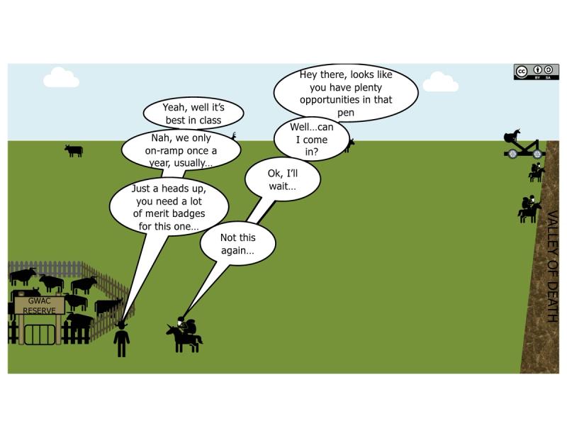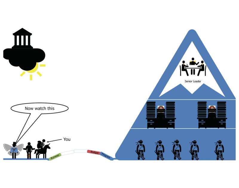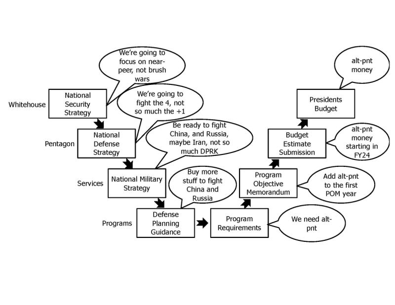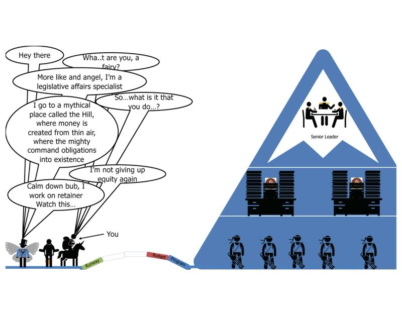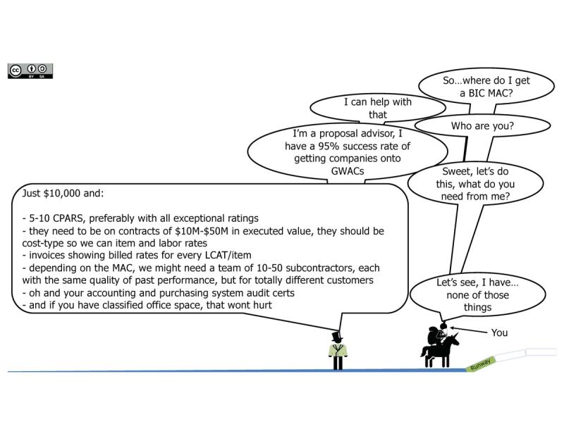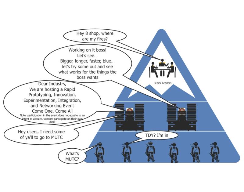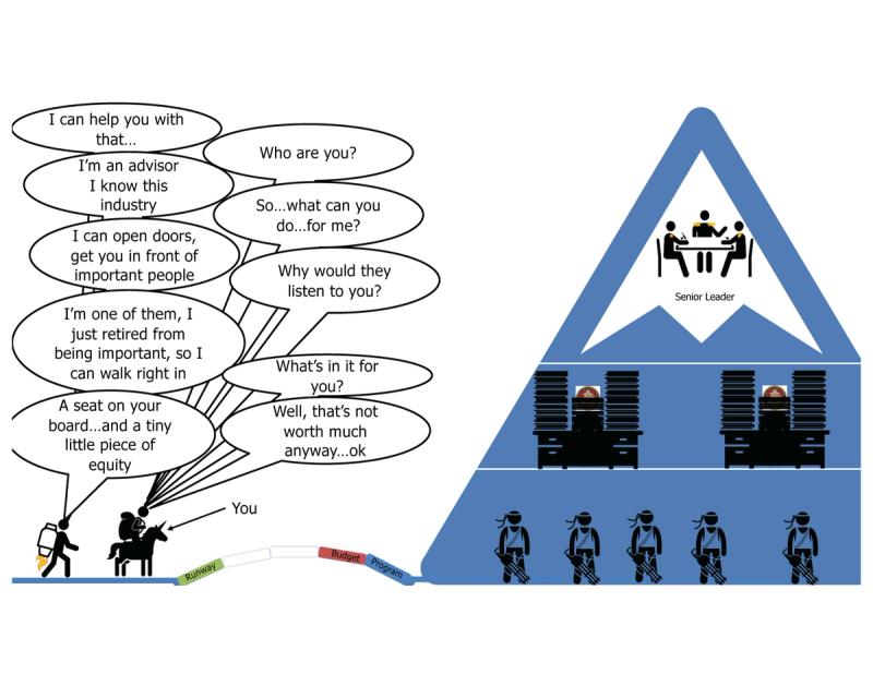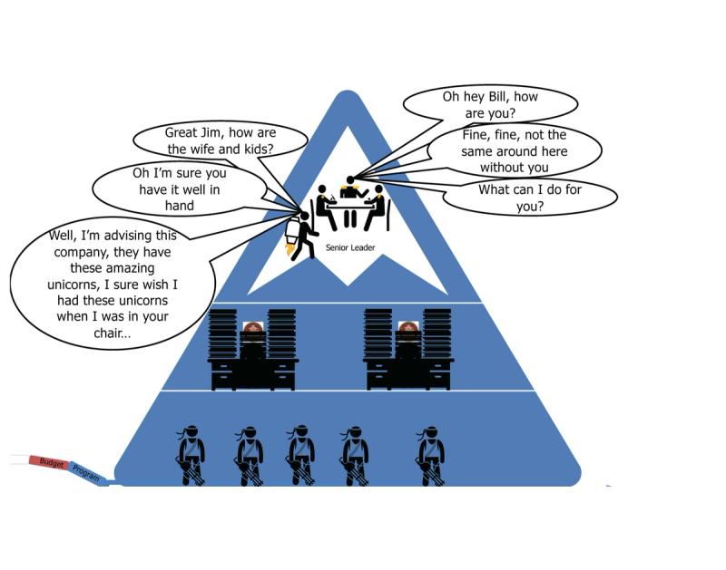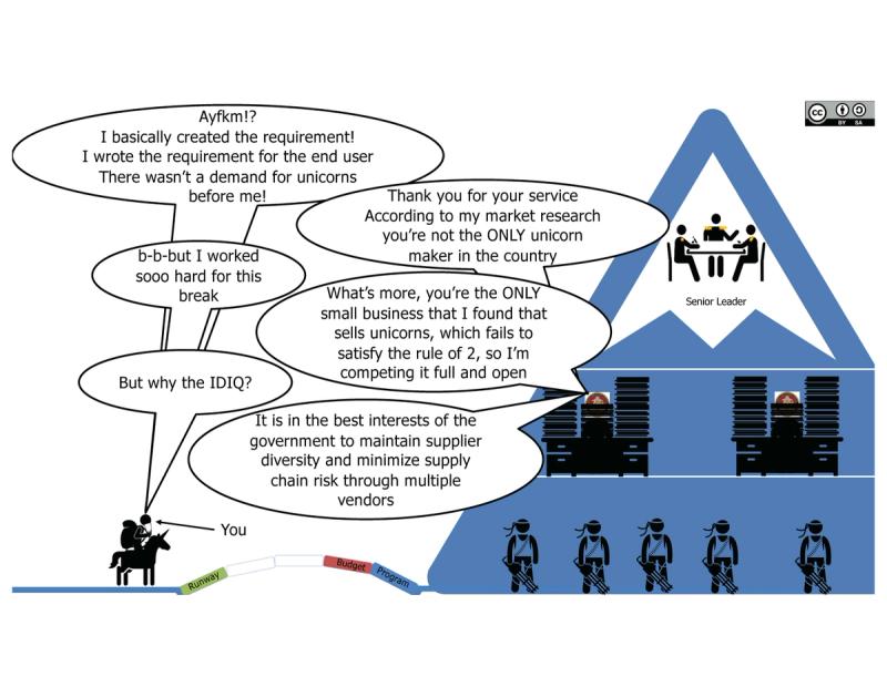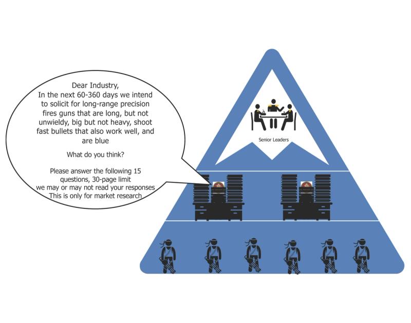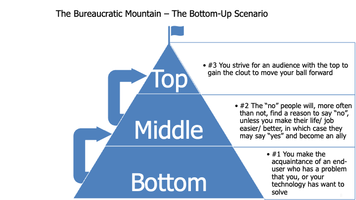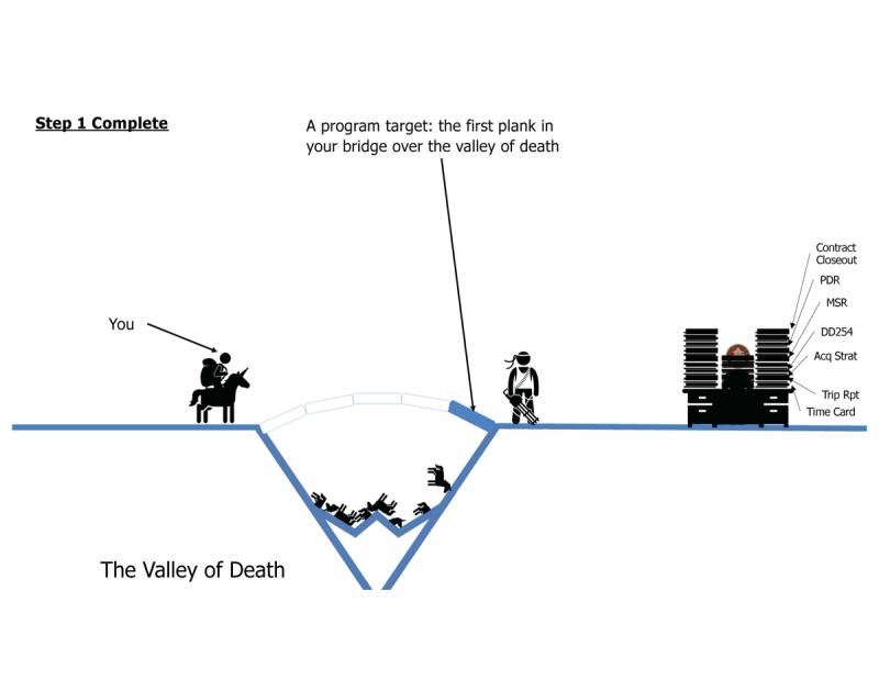 The way MOST developer folks do this (poorly) is they start with the end user, and they think that will work. There's good reason for this; developers are told by the DoD to "engage with us" and "talk to our end-users, they drive out requirements", which is true. So developers dutifully go to demo events, and expos, etc. End-users likewise reciprocate, they like new things, particularly those which promise to make their lives better. But there's a hitch: end-users don't BUY ANYTHING, the bureaucracy does.