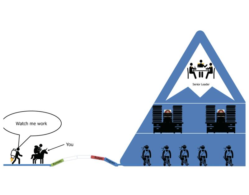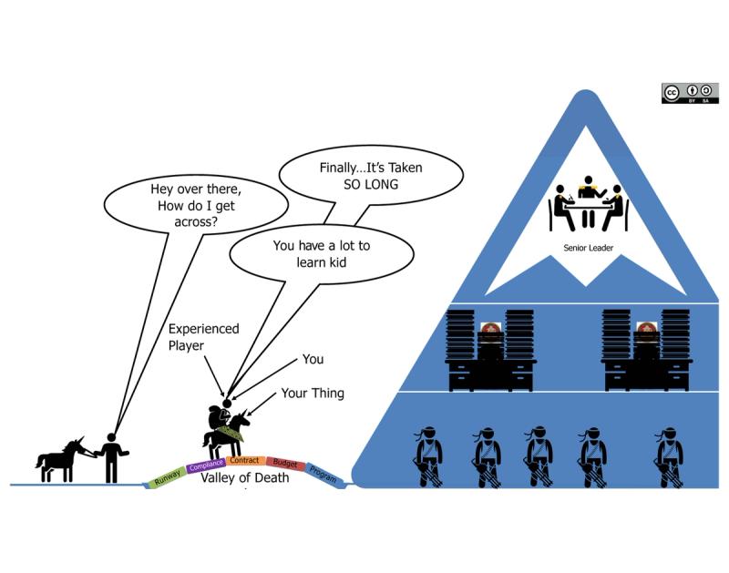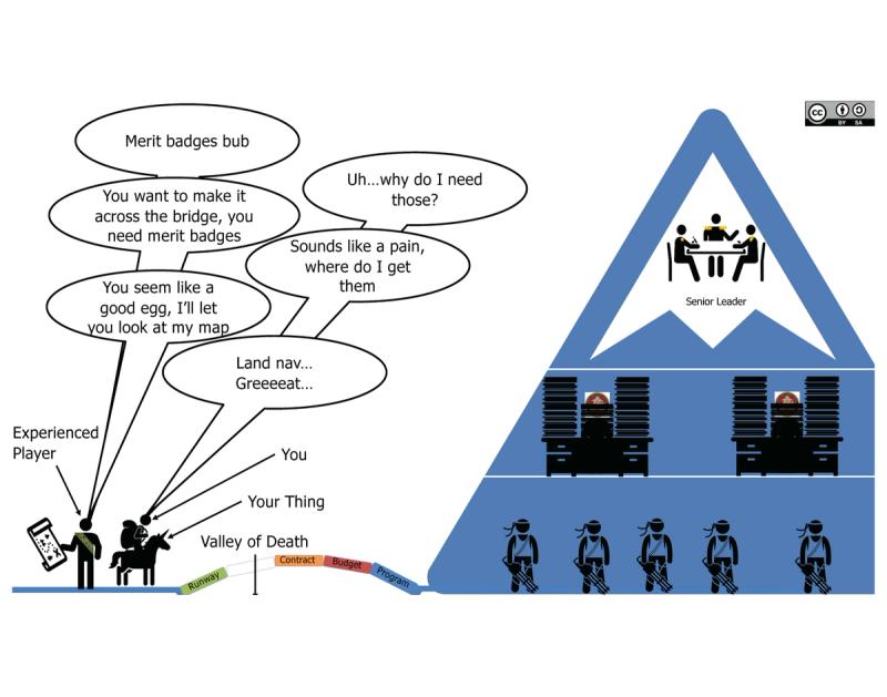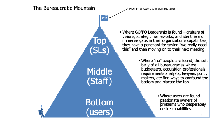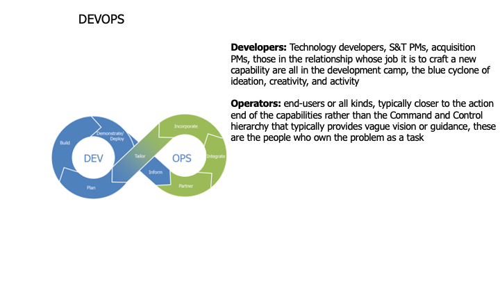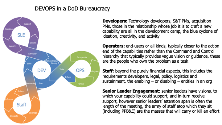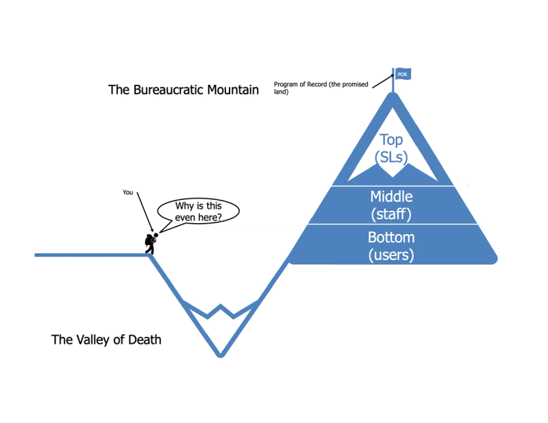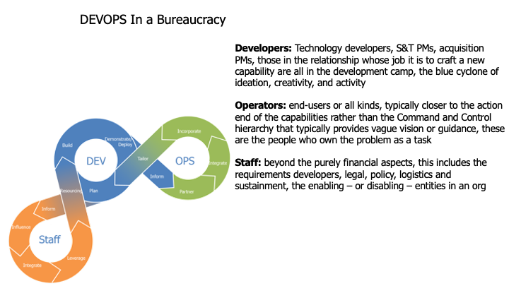 So here you have Development-Bureaucracy-Operations, how you really successfully get tech into the hands of end users and into the coveted program of record.