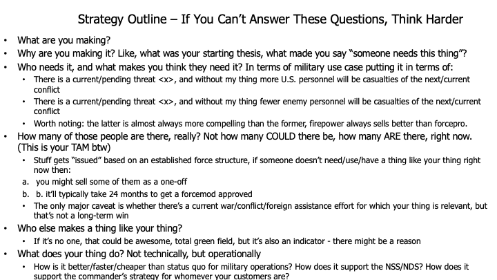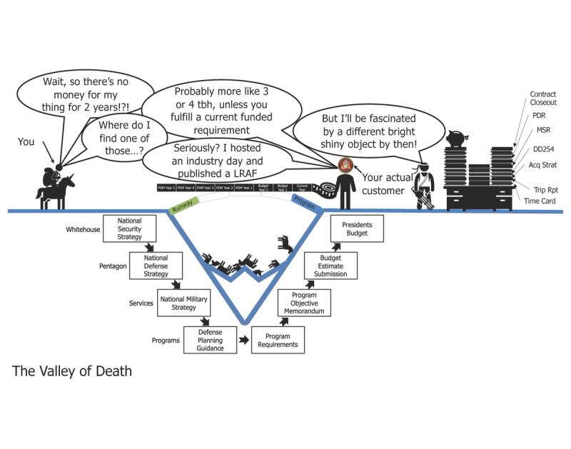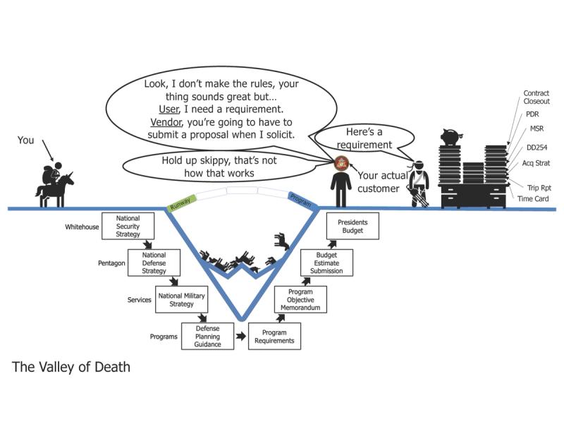 Selling tech to the civilian world is comparatively simple (simple, not easy), and there's a framework called DevOps where you find a customer, figure out what they need, and iterate through product-market fit and off to the promised land of sustainable growth, hockey sticks, etc.
