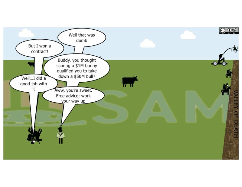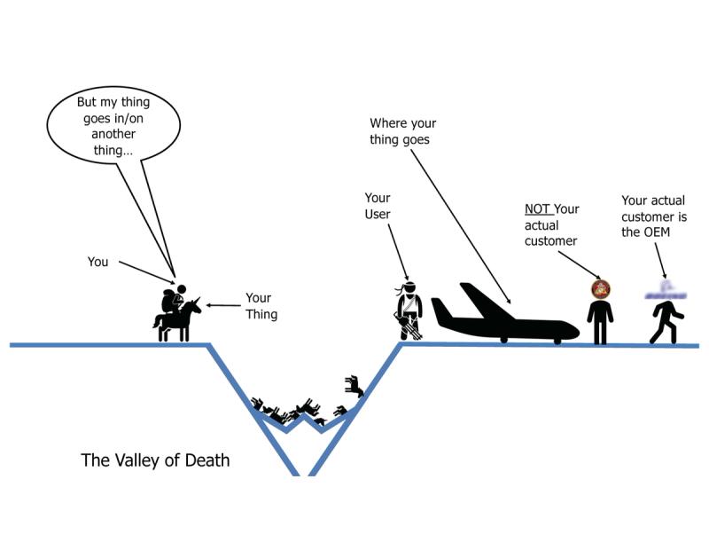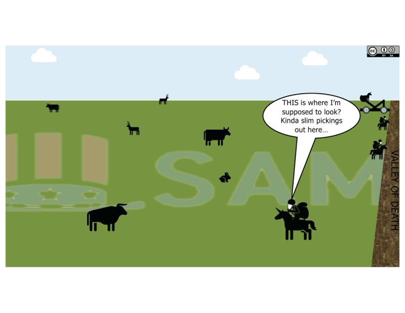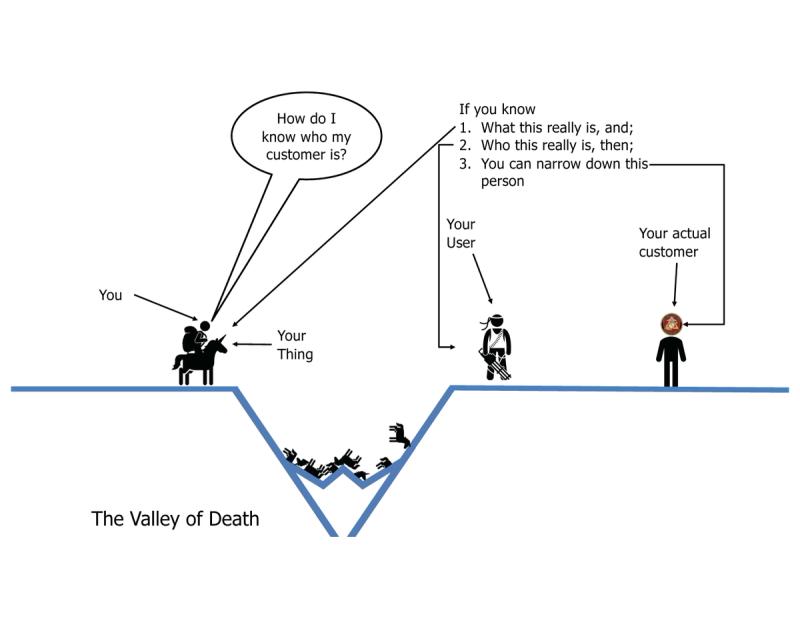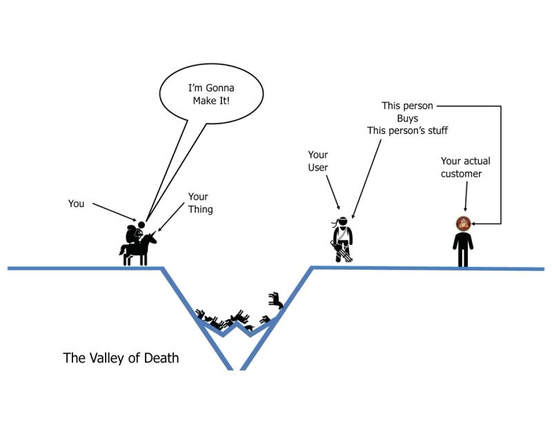The valley of death is wide and full of unicorns like yours, but it’s wider in some spots than others, and it’s infinitely wide if you’re not looking for the other side of the chasm. To put it plainly, if you’re not sure what you’re really selling, who wants it or needs it, or worse you try selling to the wrong person, then you’re going to fail.