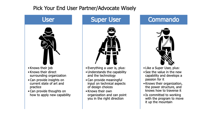 Keep in mind, you'll likely need and end-user both to inform your product development and to advocate for your capability. But not all end-users are created equal. Ideally you want one who knows their job (can inform your development), who is passionate about new capabilities (is willing to spend their free time advocating for your capability), AND knows their organization (knows who to advocate with). These end users are admittedly few and far between.