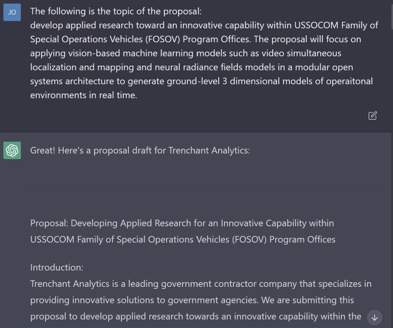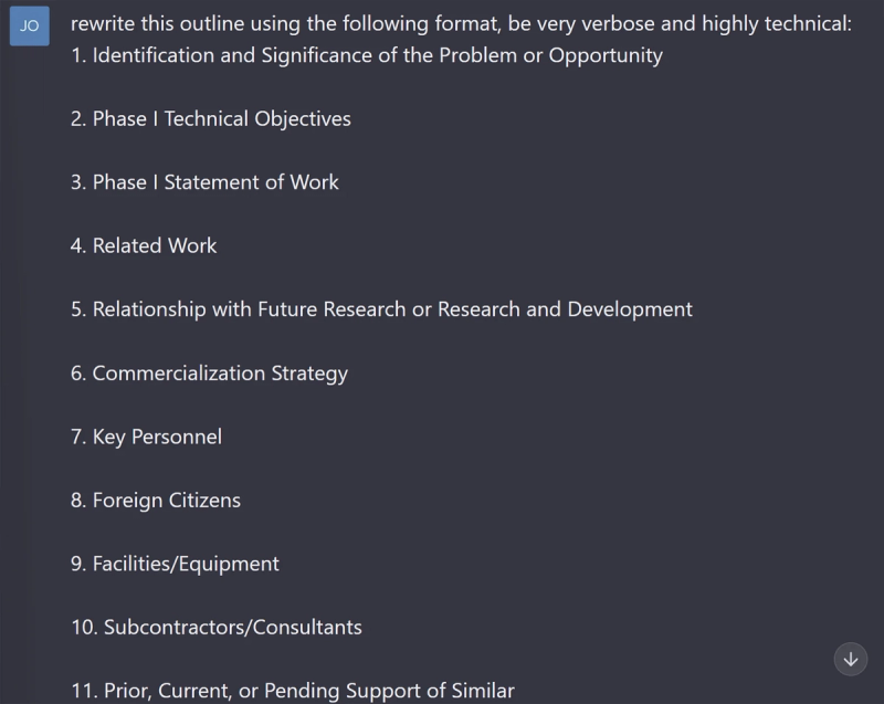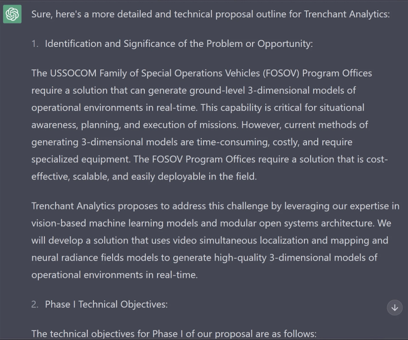 Once you have provided context for your proposal, you can start drafting it with ChatGPT. First, you will need to define the scope of your proposal – what problem are you trying to solve? This is where I insert the background or problem statement from the government SBIR topic announcement. But just putting in the government topic will get you bland results that require a ton of editing, so add in a few sentences about your approach. What research or development project are you planning?
