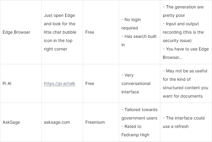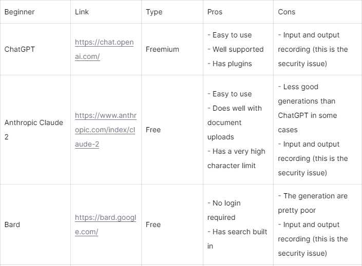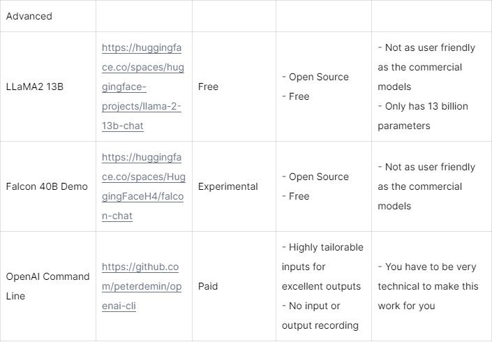 The number of Open-source models is increasing daily. A quick look at the Hugging Face LLM Rankings gives an almost overwhelming indicator of how quickly these models are coming out. For the most part these models are not ideal for beginners or even intermediate users. They generally lack the user-friendliness and extensive tuning that the commercial models offer. They are however free and don’t come with the same security concerns that are often discussed about tools like ChatGPT.
