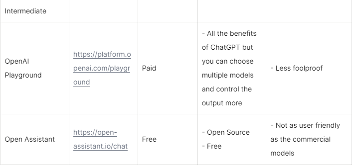 For intermediate users, you might consider using a paid product like OpenAI playground or one of the better Hugging Face model demos. These products offer more advanced features and can be more tailorable than the beginner models, especially if you're comfortable with prompt engineering.
