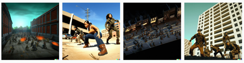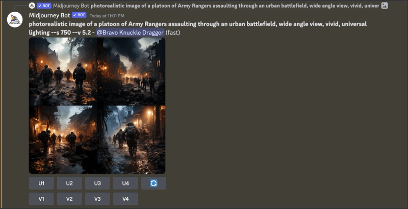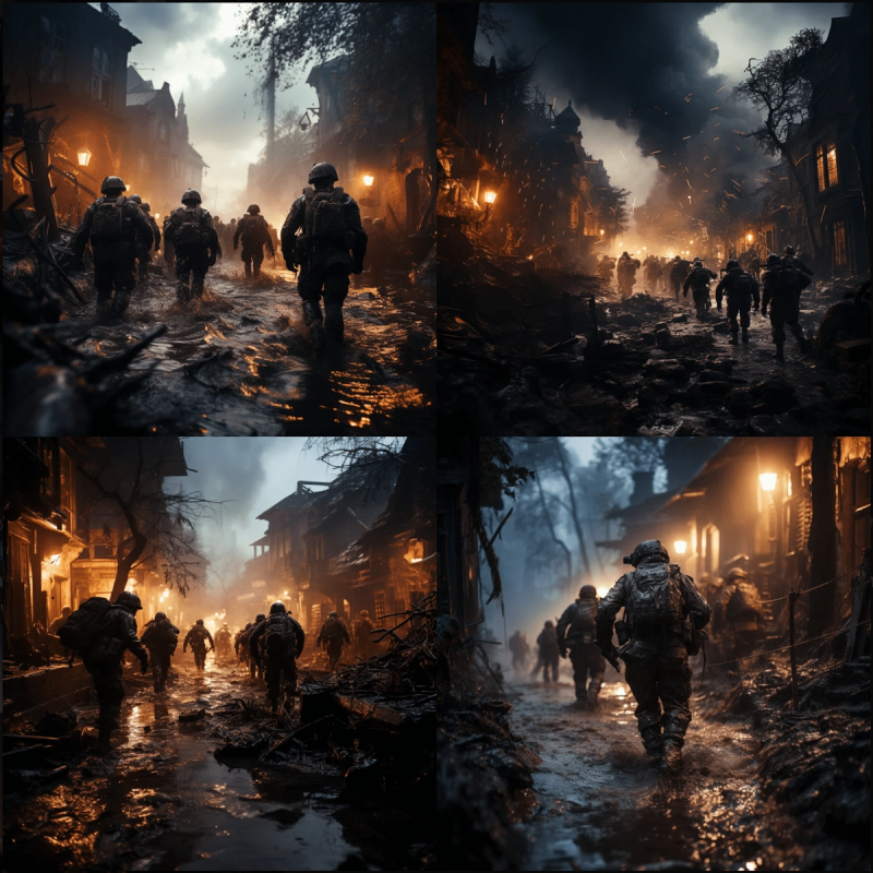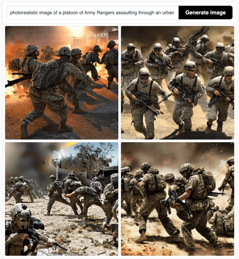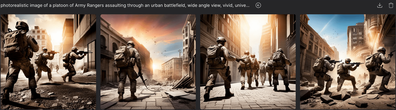 Prompt: photorealistic image of a platoon of Army Rangers assaulting through an urban battlefield, wide angle view, vivid, universal lighting