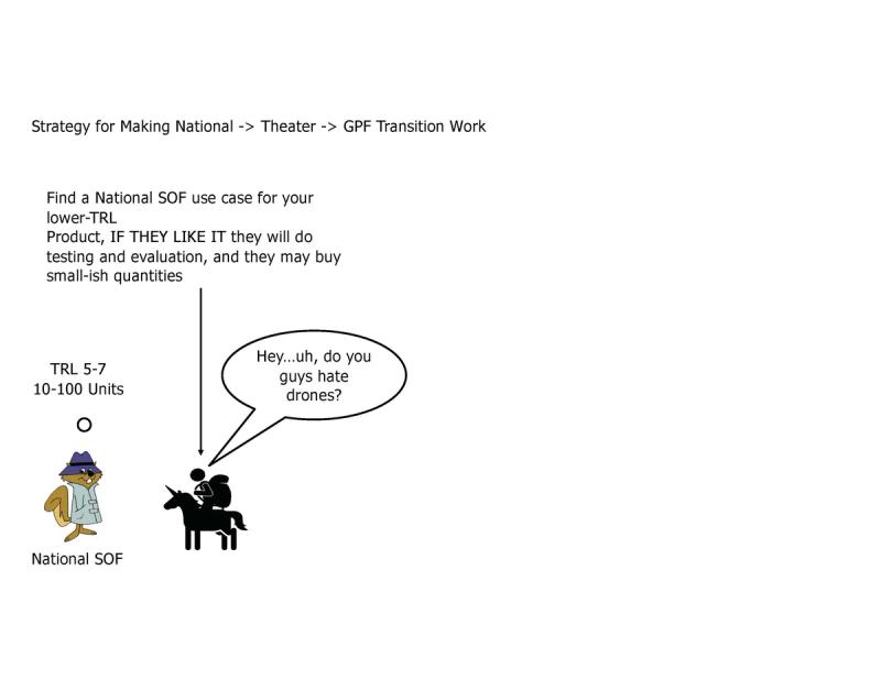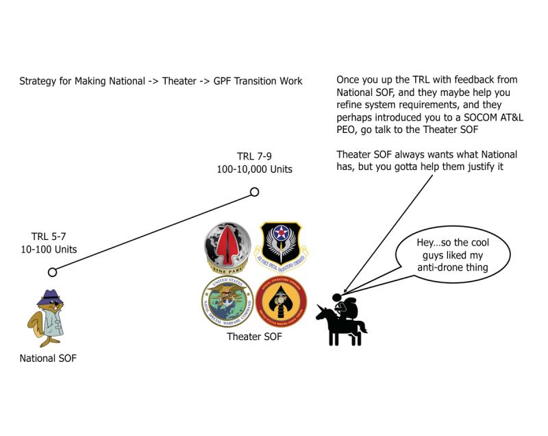 From there, as you mature your capability, that product, you get it to a higher TRL level. SOCOM or the SOCOM components will be more interested in it. SOCOM components, you know, AFSOC, USASOC, NSW, MARSOC, they are happy to buy lower TRL things than general purpose forces. And again, they're going to buy more than national stuff. There's tens of thousands of Green Berets and Navy SEALs and Air Force PJs and Marine Corps Raiders. So they will take a slightly higher TRL thing. It doesn't necessarily have to be all the way through all the acquisition wickets. But again, they're not going to buy 100,000 units like a big Army or a big Air Force will. So again, you kind of take that to the next stage, you get their operational feedback, you sell a fair number of units to them. You can actually make a living off of selling to Theater SOF. To the big SOCOM, AT&L, PEOs, a lot of folks do.