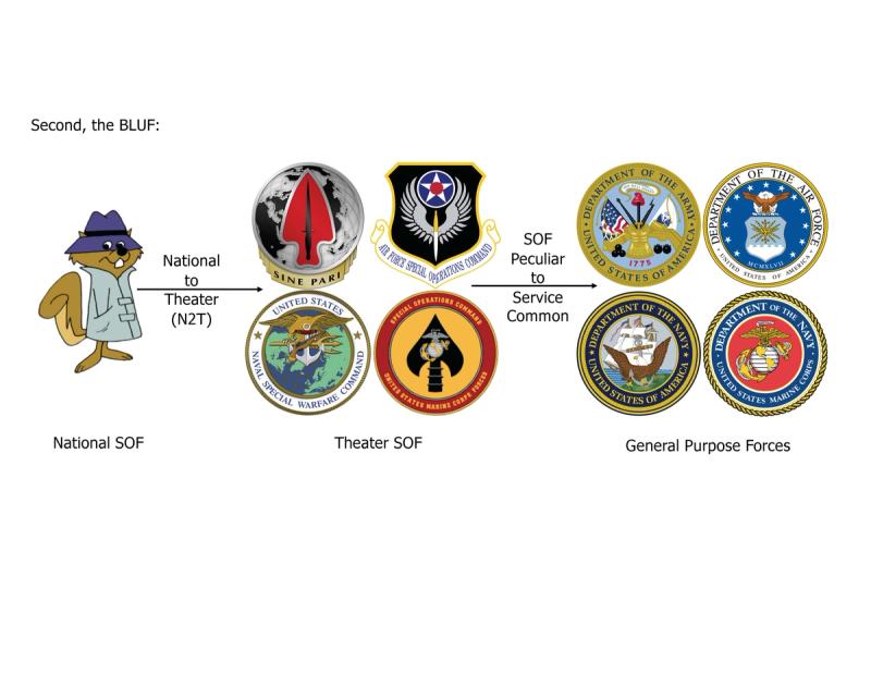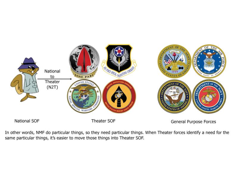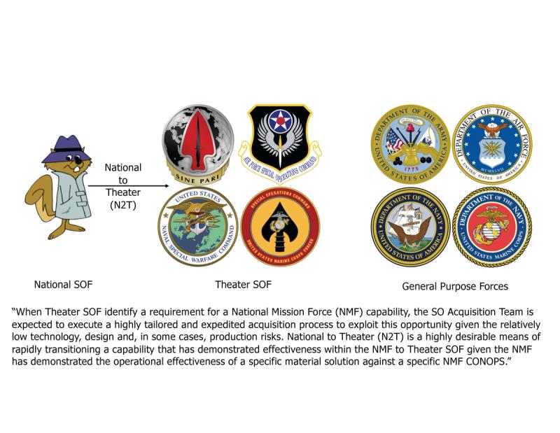 What we are going to talk about is how there is a process, there is a beaten path, if you will, of transitioning capabilities from national SOF to theater SOF. It's actually referred to by SOCOM documents as N2T, national to theater transition of technology. And there's also SOF peculiar, so SOF specific to service common, right? To transition of capabilities from special operations to general purpose forces. This is another known and well-beaten path that has been successful in the past, okay? So this is what we're going to talk about. This is a approach, this is an approach to transitioning technology. If you're interested in selling to SOCOM, it's great. You should know about how this path works.