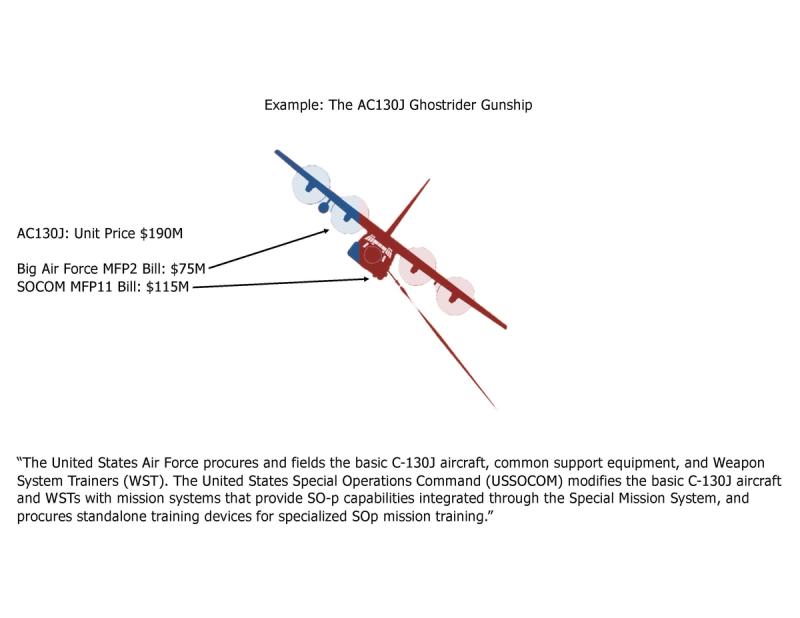 So what they do is the Air Force buys C-130s for the entire Air Force. Everyone who needs C-130s across the entire Air Force to include Air Force Special Operations Command, everyone gets C-130s. The C-130 program office in the Air Force buys all the C-130s. SOCOM does not buy C-130s. They're not allowed to buy C-130s because a C-130 cargo aircraft is not unique to SOCOM. It is not a SOCOM unique requirement. They don't have a special need for C-130s. What they have a special need for is a targeting computer and howitzer and a 20 millimeter gun and a fueling, you know, stab so they can do in-flight refueling. All those things are SOF unique, those only have to be added to the aircraft for SOCOM missions because only SOCOM uses C-130s to shoot things from the sky.