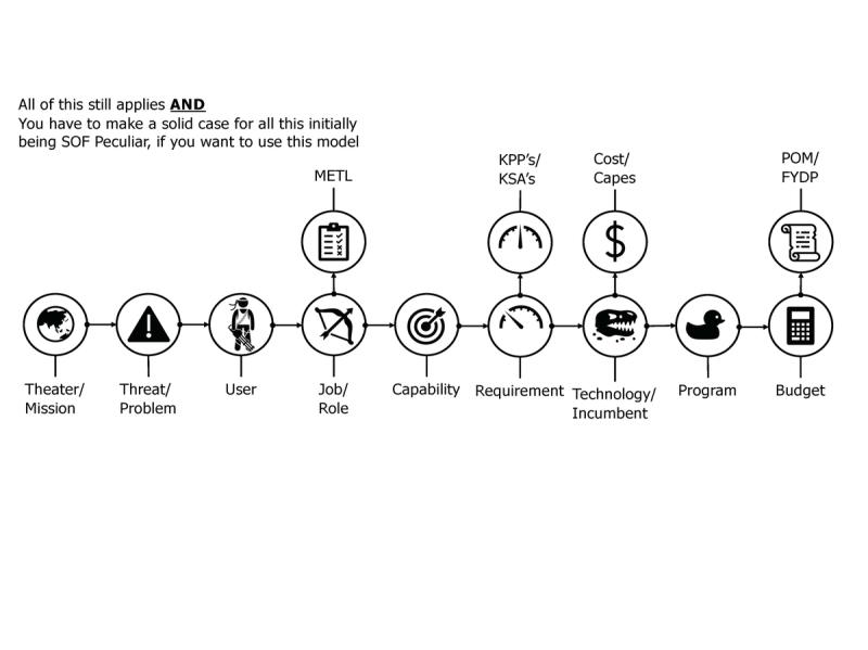 None of this special operations selling strategy stuff negates the overall go to market strategy. You have to make all of these buttons line up. You have to identify the theater, the mission, the threat, the user, the job role, the mission essential task list, and line that up with your capability. On top of that, in order to sell into SOF, you have to make a strong and defendable case that that theater, mission, threat, problem, user, and job role are SOF-peculiar. That your capability applies to a SOF-peculiar use case. If anybody, SOCOM, and SOCOM will do this litmus test because they would rather spend the Army, Navy, Air Force, Marine Corps' money on a capability they get than spend their own money.