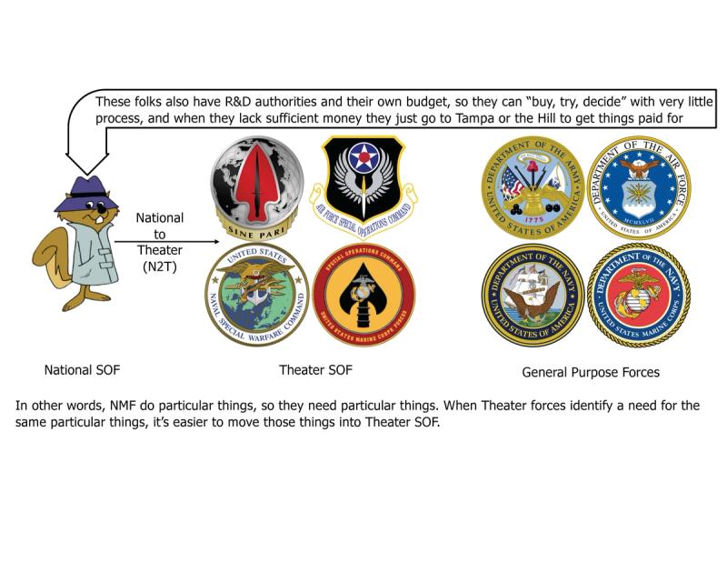 National SOF also have kind of a small-ish budget. They can buy, try and decide. They might buy five different versions of a thing. They might buy the same thing from a couple of different companies. They might buy a radio from company A and a radio from company B and see which one works better. Whereas the theater SOF folks and the general purpose forces don't have the ability to move that quickly. They also have a lot of power in general terms over the dollars that are spent down in Tampa and they have some pretty decent clout on the Hill. So if they need something and there isn't money for it, they have ways of getting that money. So the bottom line foot stomp here is if they want your thing, generally they can get your thing, which is great, right? If you're trying to break in, that's a great avenue for a lot of early stage things.