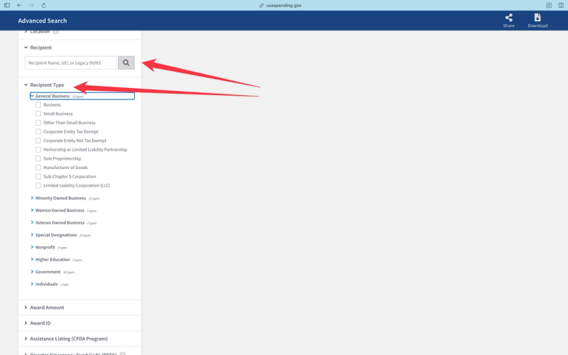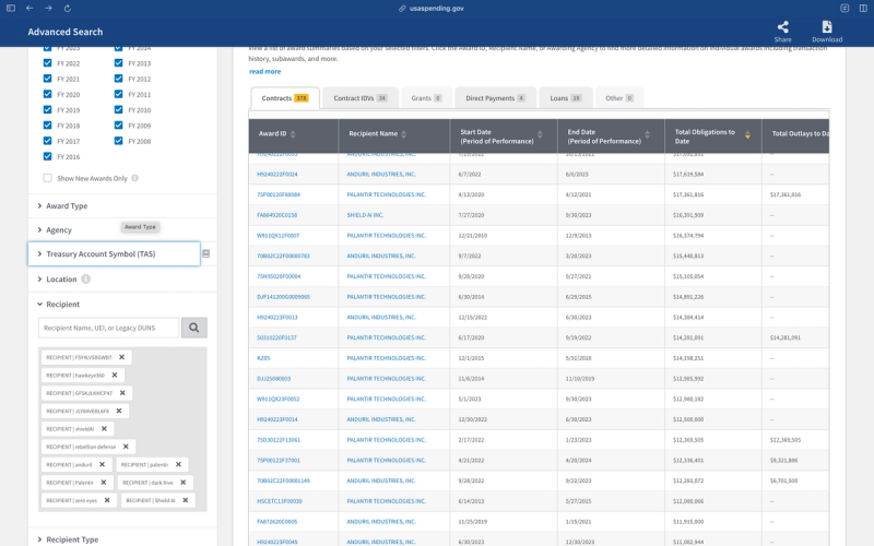 You can use the name search and/or use the Unique Entity Identifier that every SAM-registered government contractor has. Here we narrow down to some of the top DoD Unicorns.