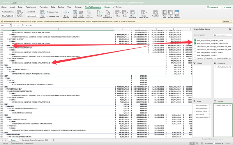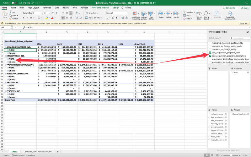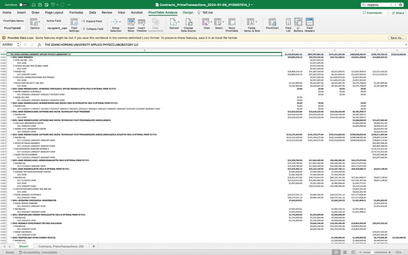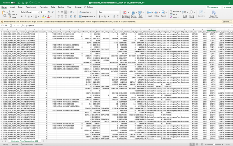 Ok, so pulled down a data dump from usaspending, we only pulled the Army PROC, RDT&E, and some O&M, its still a lot of data.