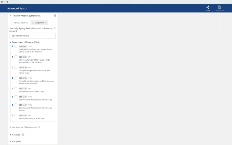 As you can see here, we can organize the data by treasury account, program, ordering organization, funding organization, etc.