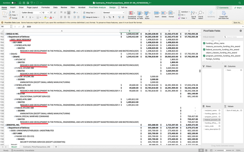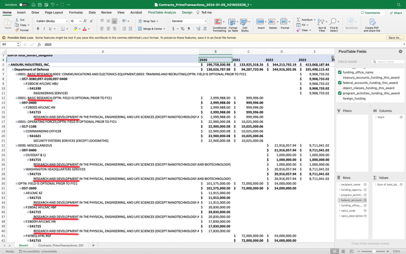 Now, personally, if I wanted to know if my unicorn has some staying power I wouldn't want to just see the RDT&E lines, which we can sort by federal account, and then really drill in using NAICS and PSC codes.
