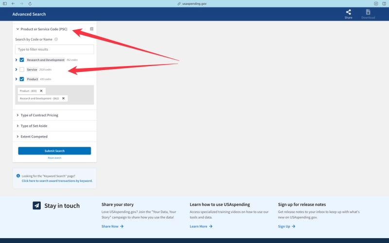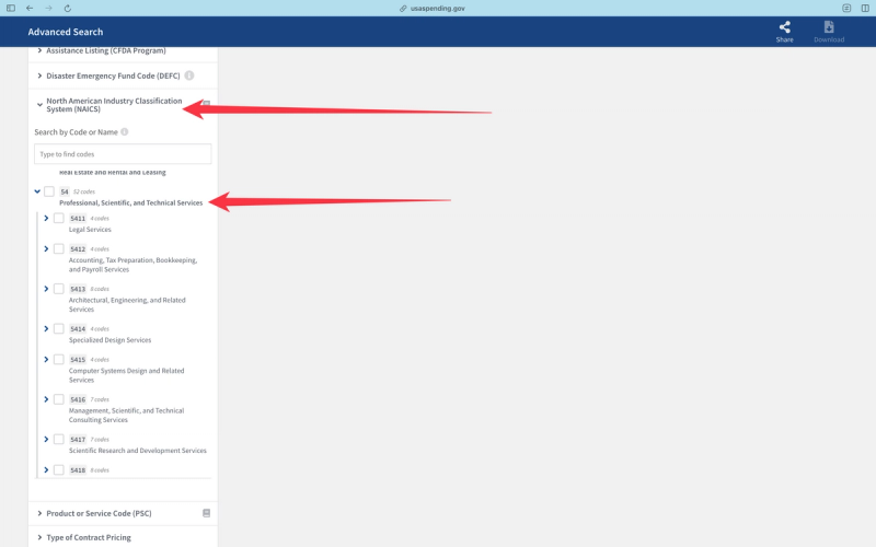 If you're not sure which NAICS or PSC code to filter on (there are a lot of both) try this: