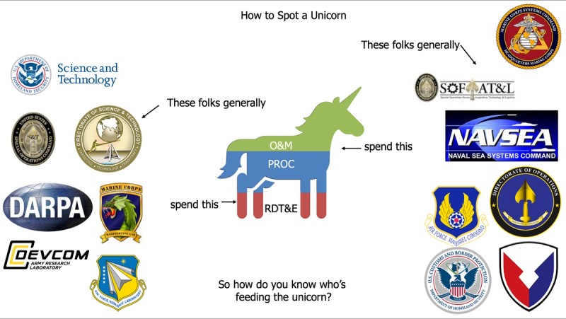 If I want to find a good bet for a Unicorn that has a toe hold on the right hand side of the valley of death, what I would do is look for a company who has a past of receiving RDT&E funding, and then picking up increasing amounts of PROC funding, followed by O&M funding.
