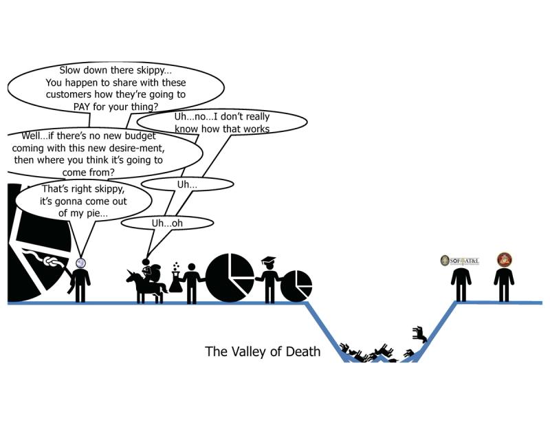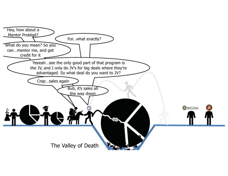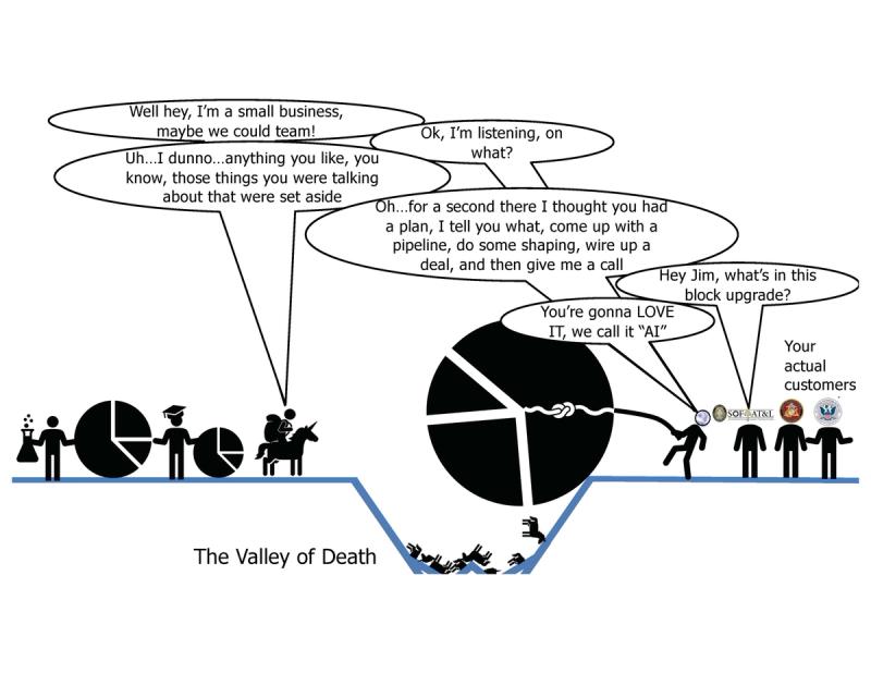 Partnering with a large business could be a great way in, after all that large company has current relationships with the customer, current funding, and their own bridge over the valley of death.